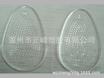 前掌垫垫在脚掌位置,制品一般厚度2~3mm,需要材料硬度要软,再就是比较爽滑,不发粘。因此通常采用SEBS基材改性之TPE透明料,硬度通常在邵氏硬度5~10度。